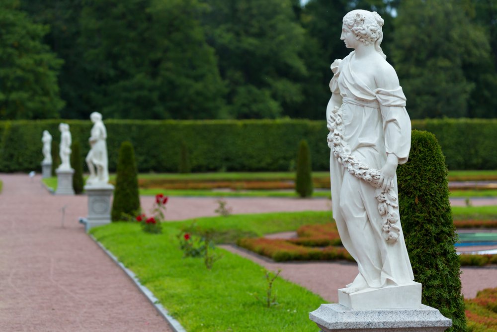 • Нижний сад с великолепными парковыми ансамблями и тематическими скульптурами («Осень», «Зима», «Весна», «Лето», «Земля», «Воздух»);