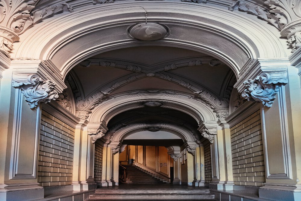 Перед вами — мраморные лестницы, витражи ручной работы, кованые решётки старых лифтов и лепнина с инициалами владельцев.