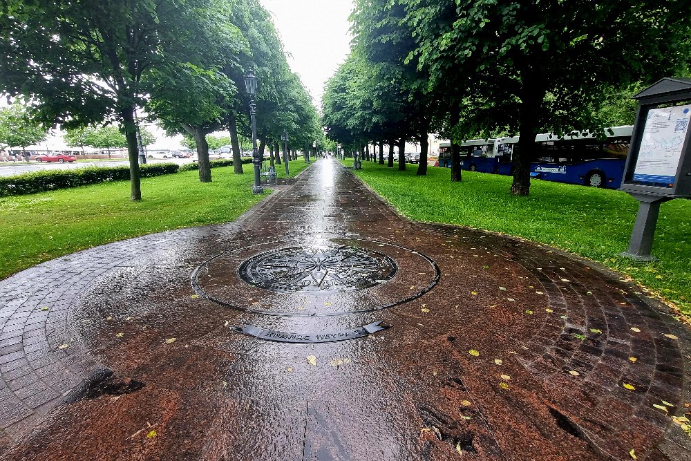 • Вы пройдете по Петровской набережной, которая вымощена гранитными плитами длиной 84 см, что соответствует длине шага Петра I. На всем маршруте в плиты вмонтированы декоративные элементы: бронзовые следы императора, символы его эпохи (якорь, компас, пушки), буквы гражданского алфавита, введенного Петром.