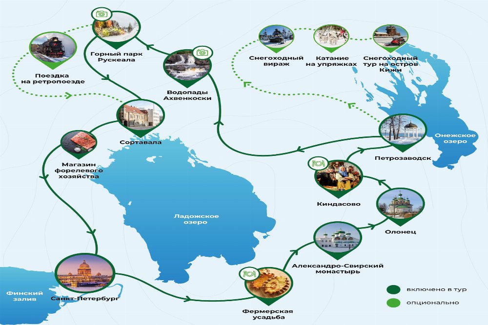 Путешествие, которое покажет вам культуру, самобытность и лучшие достопримечательности Карелии. А в свободный день в Петрозаводске вам будет предложено разнообразие активных развлечений: вы сможете покататься на упряжке милых северных хаски, попробовать себя в управлении снегоходом в вотчине карельского Деда Мороза или отправиться в полноценный снегоходный тур на остров Кижи по заснеженному Онежскому озеру!