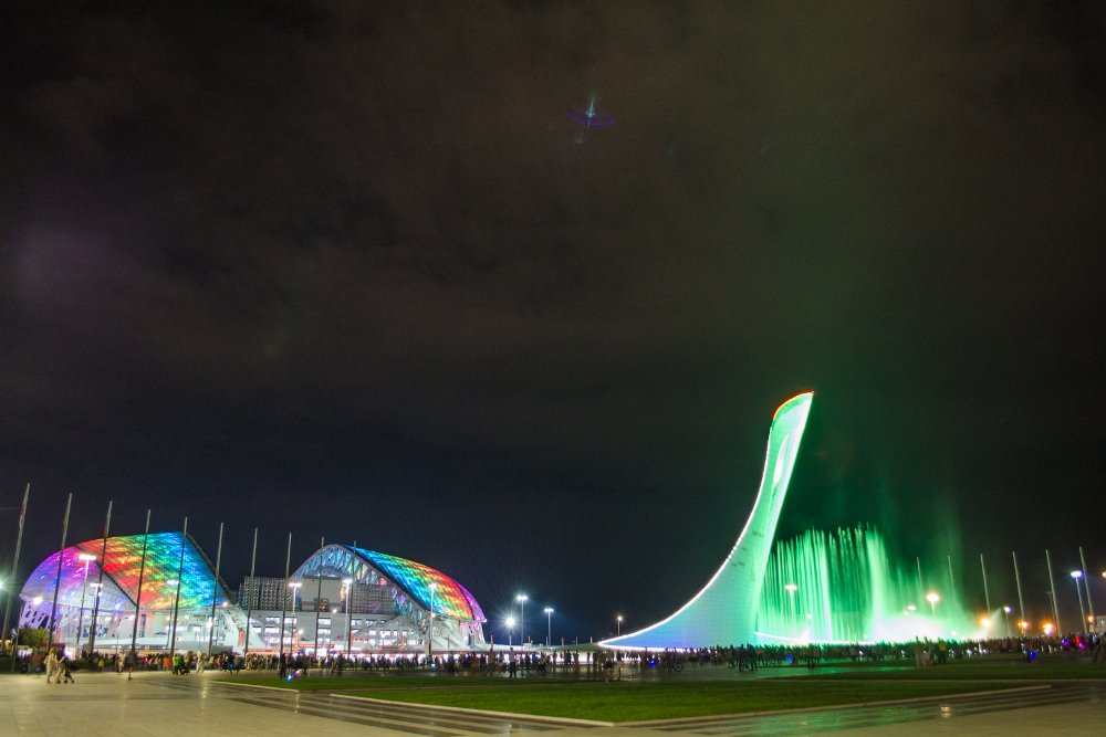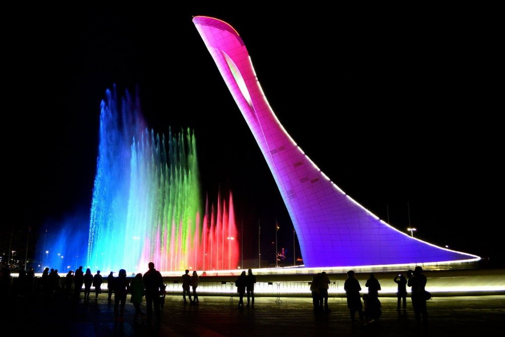 Экскурсия на Красную Поляну закончиться в Олимпийском парке. Мы приедем сюда под свет вечерних огней на красочное шоу поющих фонтанов и узнаем историю всех местных олимпийских объектов.