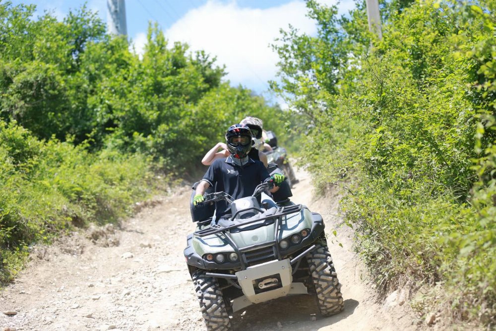 По горной каменистой дороге мы попадем на смотровую площадку, с которой открывается открыточный вид панорамы Кавказских гор. Сделаем фото на память, сидя на квадроциклах, и насладимся видами. Затем дорога заведет нас в тропический лес, где мы попадаем в настоящую сказку. Извилистые столетние деревья, поросшие мхом и растениями, таинственный полумрак даже в самую солнечную погоду, каменные породы причудливых форм — все это впечатляет не меньше, чем препятствия на пути квадроциклов.